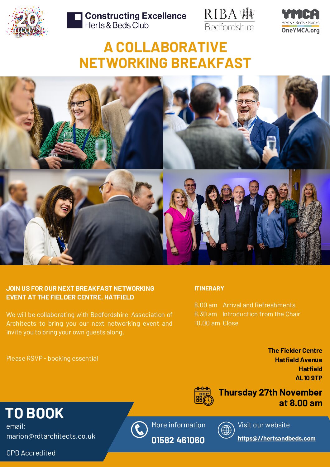 Fielder Centre Hatfield Avenue, Hatfield, United KingdomJoin Us for Our Next Breakfast networking Event at the Fielder Centre, Hatfield. We will be collaborating with Bedfordshire Association of Architects to bring you our next networking event and invite you to bring your own guests along. Please RSVP to [email protected] or phone 01582 461060 - booking essential.